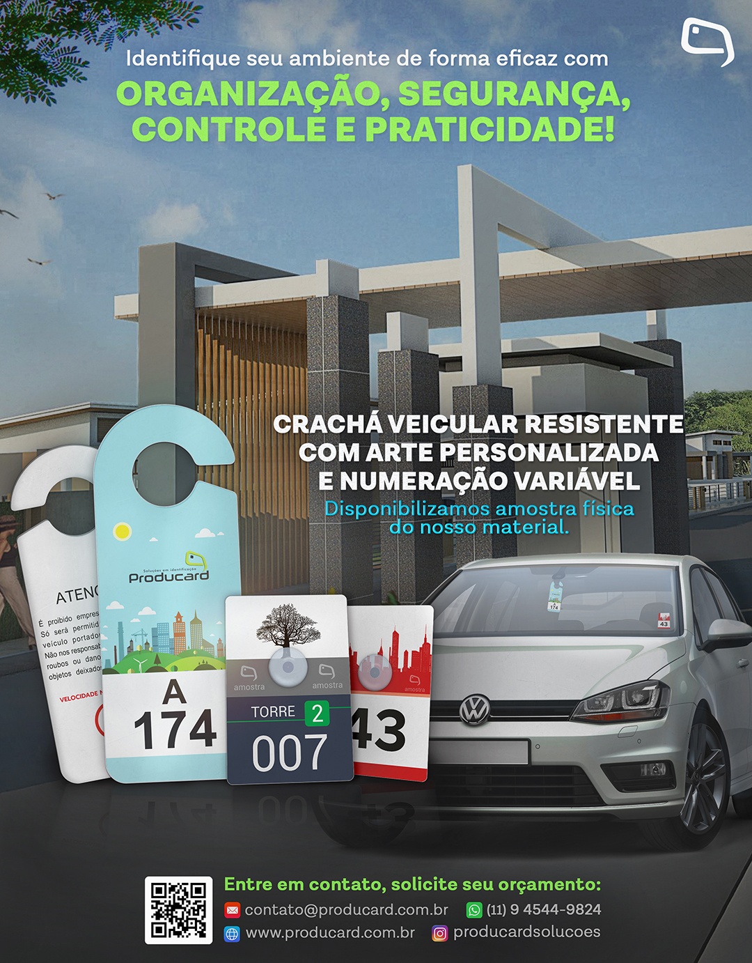 Organize o estacionamento da sua empresa ou condomínio com os crachás veiculares da Producard. Nossos crachás são fabricados em PVC Rígido com Laminação Cristal, um processo que blinda a impressão e garante que os dados e cores não desbotem com a exposição ao sol. Uma solução prática, profissional e de alta durabilidade.