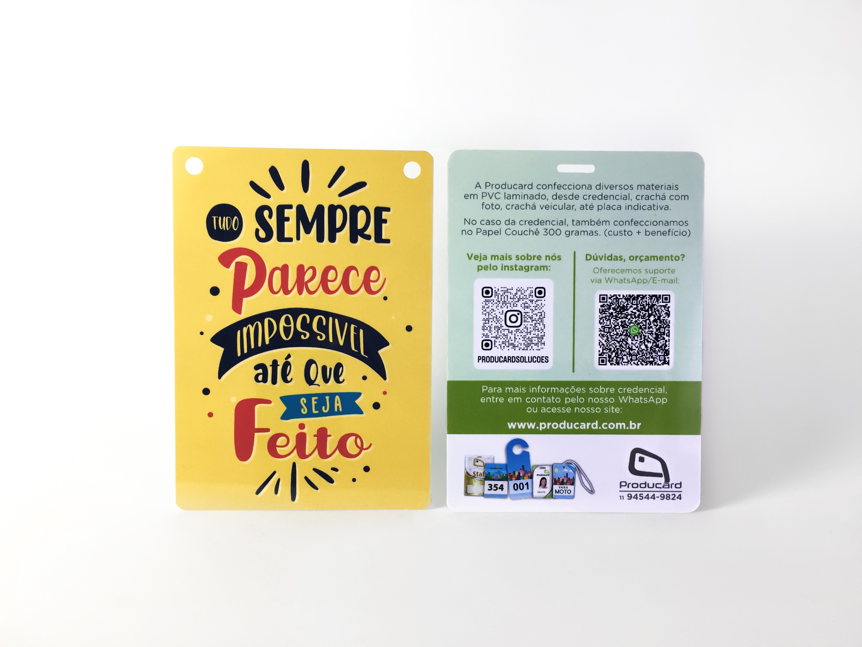 A nossa credencial possui tecnologia de impressão digital e Laminação Cristal, entregamos um material flexível, que não desbota e suporta toda a jornada do seu evento, seja ele de um dia ou uma semana inteira. Também temos a credencial de custo-benefício feita em papel couchê 300 gramas, mais utilizada para eventos de curto prazo ou de baixo orçamento, prazo de fabricação é menor e ainda assim possui alta qualidade de impressão semelhante à credencial de PVC, sendo menos recomendada para eventos com dias consecutivos.